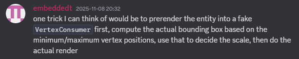 The main question is how to determine the correct scale and offset for each entity to display them properly within the GUI. How do you work around the limitation of only knowing the bounding box? How do you handle entities with unique models or animations?