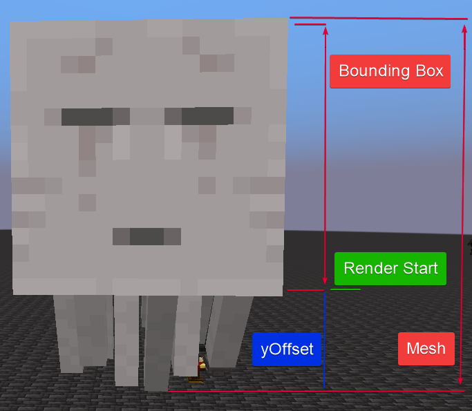 The biggest challenge when rendering entities is that Minecraft does not expose their actual sizes. The only available information is their bounding box, which does not always accurately represent their visual size. Consider the Ghast: the tentacles are not included in the bounding box, leading to a misleadingly small representation if rendered based on that. Another challenge is the height offset. Some entities align on the Y-axis plane, meaning they sit right on the ground. Others start below it or hover above.