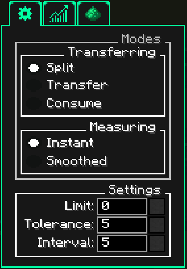 This page explains all settings that can be configured for the Energy Meter. To access the settings, place the block and interact with it to open its user interface. The interface is divided into two sections. The left panel is the global panel and is always visible. The right panel depends on the currently selected tab in the top tab bar.