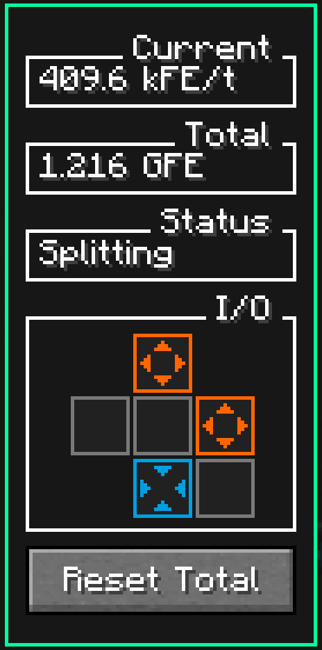 This section is used to configure the sides of the block. Each side can be configured as an input, an output, or disabled for energy requests. The front side cannot be configured because it is reserved for displaying the flow rate on the block. The sides can be configured using left-click or right-click. It is also possible to reset a single side instantly or reset all sides at once. More details can be found in the tooltips of the respective buttons.