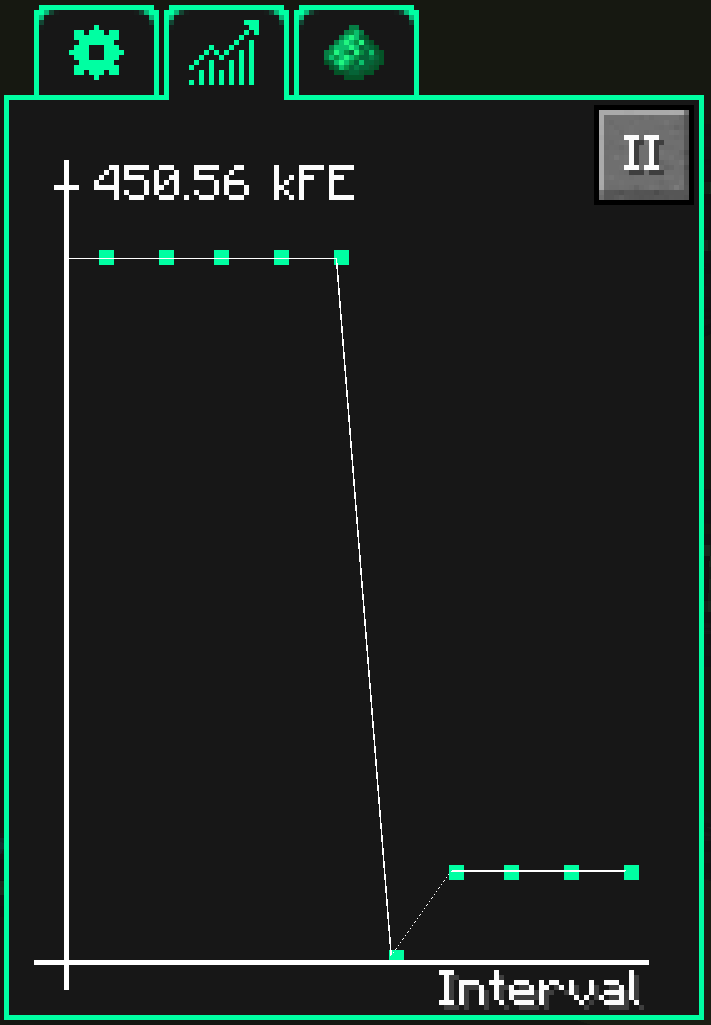During an interval, the energy supply may temporarily stop. In that case, the flow rate is only set to zero once the entire interval has elapsed. This makes it difficult to detect interruptions when long intervals are used. By default, tolerance is 5 ticks (0.25 seconds). This means it is acceptable for the energy flow through the Energy Meter to be zero for up to 5 ticks. If no energy is transferred on the 6th tick, the interval ends early. This option is therefore only useful when the interval is greater than 5 ticks.