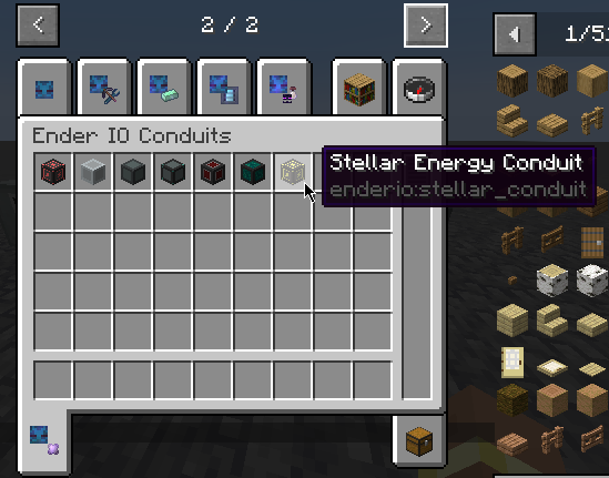 In this example, we add the Stellar Energy Conduit with the id enderio:stellar_conduit and a transfer rate of 50000 RF/t.